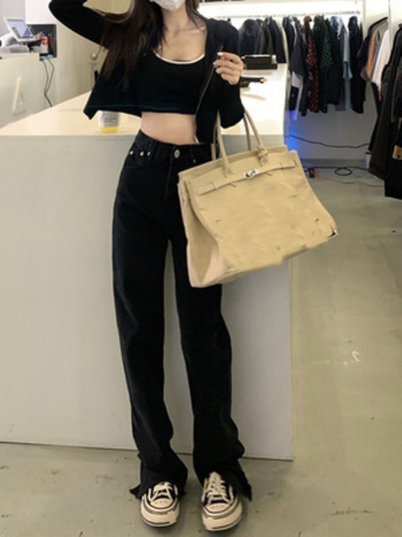 【1118-20】ハイウエスト ワイドレッグ ジーンズ 女性服 設計感 ニッチ スリットパンツ 秋 ルース