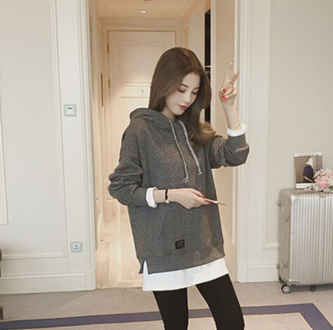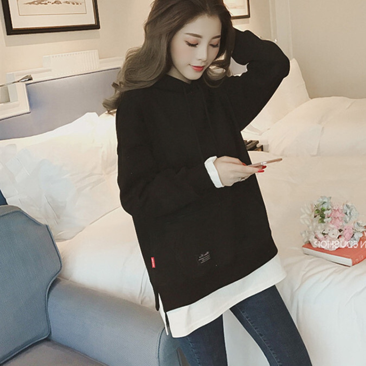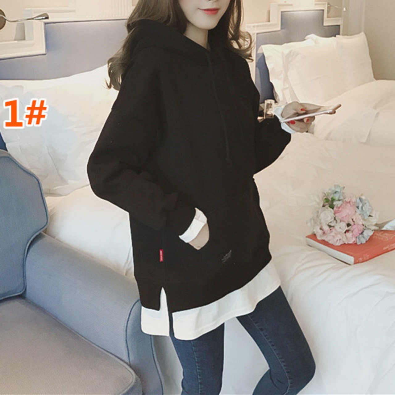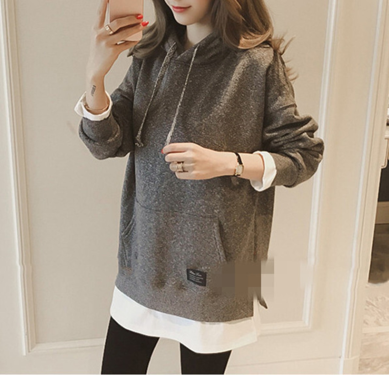 【0107-1】パーカー 重ね着風 プルオーバー 長袖 帽子付き レディーストップス ゆったり 人気新作
