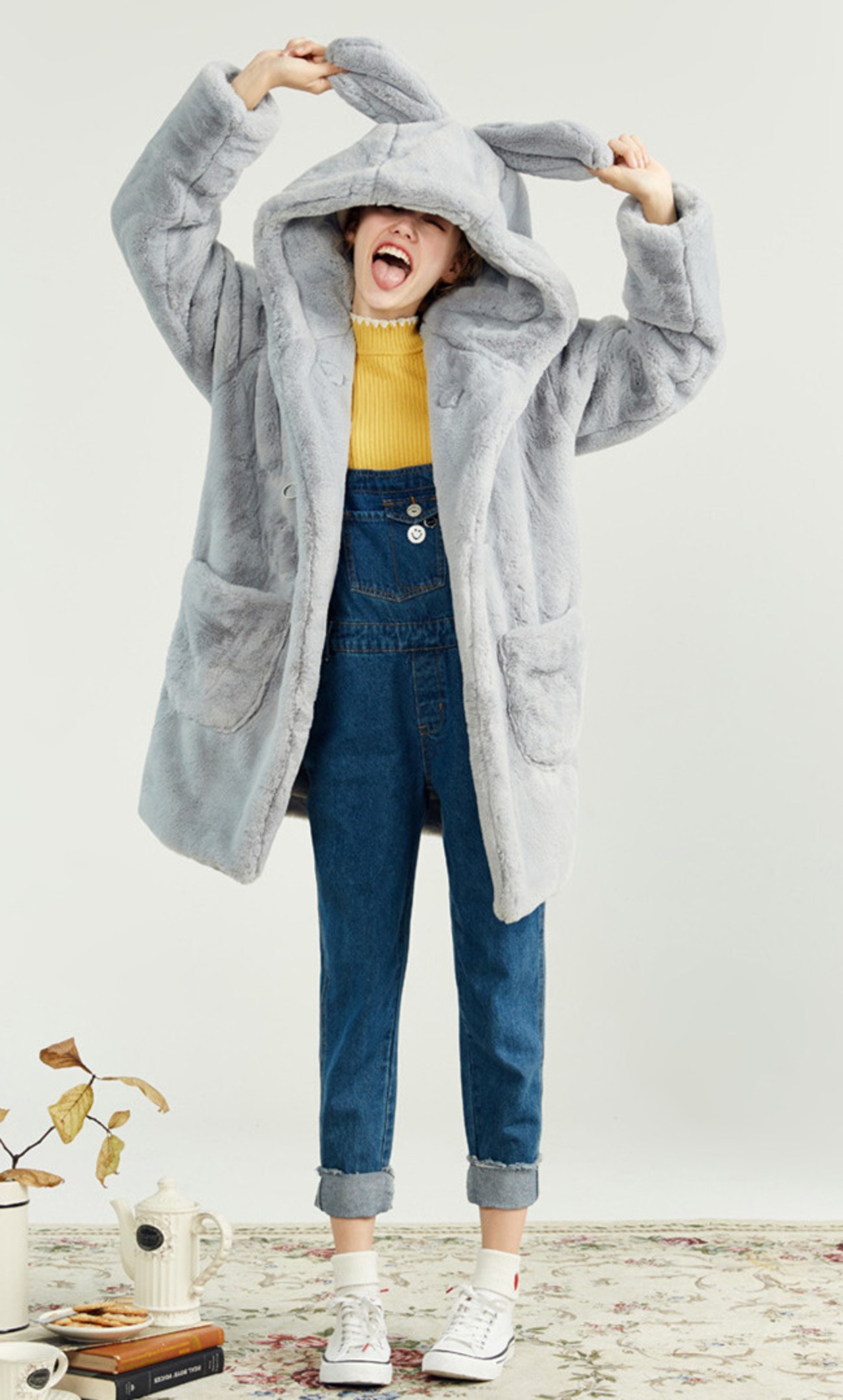 【0110-2】雪ウサギ耳付きファーコート フード付きフェイクファーコート