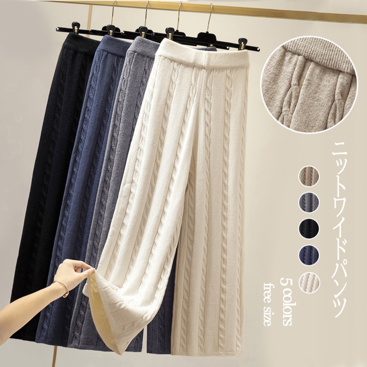 【0122-4】レディース ロング丈 ズボン ニット リラックスパンツ ゆったり 足長効果 ゴムウエスト