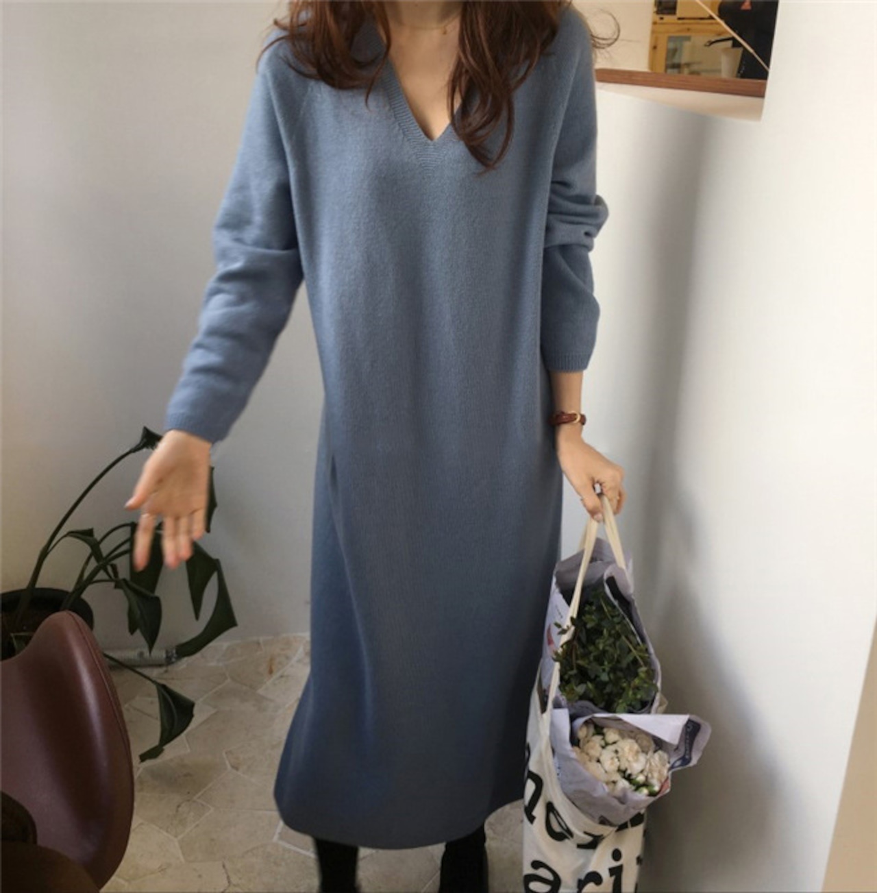 【0125-6】2022新作 レディース ロング ニット ワンピース リブニット 長袖 フリー 秋冬 Vネック 長袖 伸縮性 無地